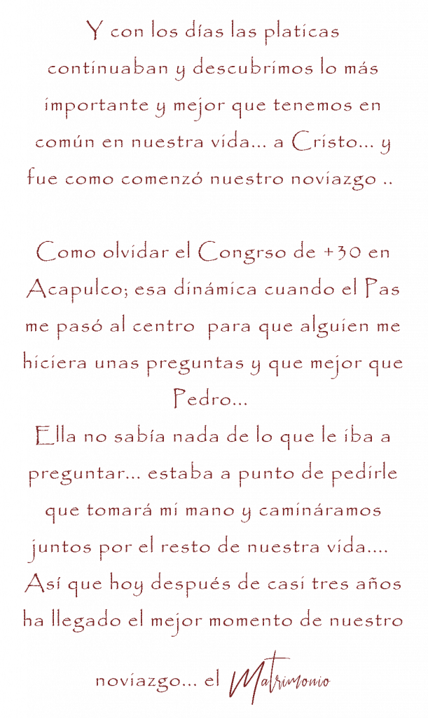 Dios les ha permitido juntar sus vidas, con un propósito crecer a su imagen, Él sabía perfectamente lo que ustedes necesitaban. Le quiero dar muchas gracias a Dios por la vida de mi amiga y por qué Dios le puso en su camino justo a la persona que ella necesitaba, a Pedro. Su historia dice que fue un bello camino y que finalmente Dios les ha permitido llegar a este momento.
